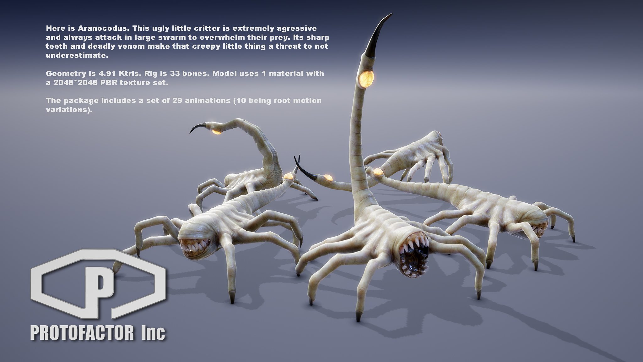 Here is Aranocodus. This ugly little critter is extremely agressive and always attack in large swarm to overwhelm their prey. Its sharp teeth and deadly venom make that creepy little thing a threat to not underestimate.